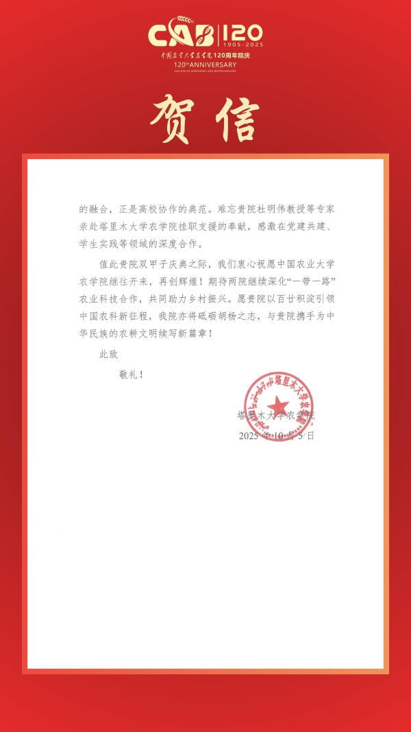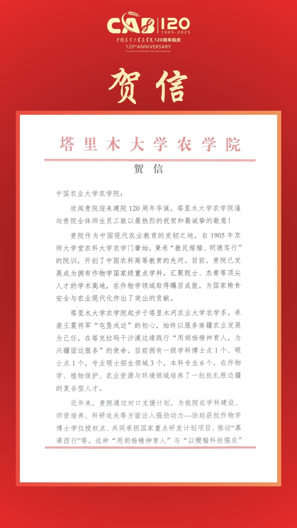 贺信|塔里木大学太阳集团城娱8722致信祝贺太阳集团城娱8722建院120周年