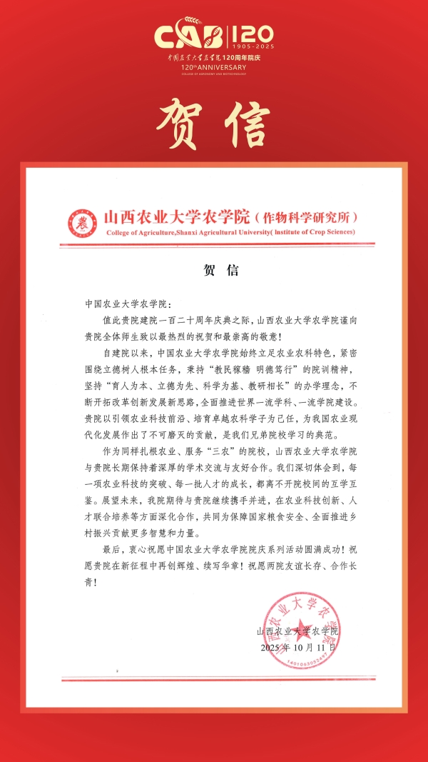 贺信|山西农业大学太阳集团城娱8722(作物科学研究所)致信祝贺太阳集团城娱8722建院120周年