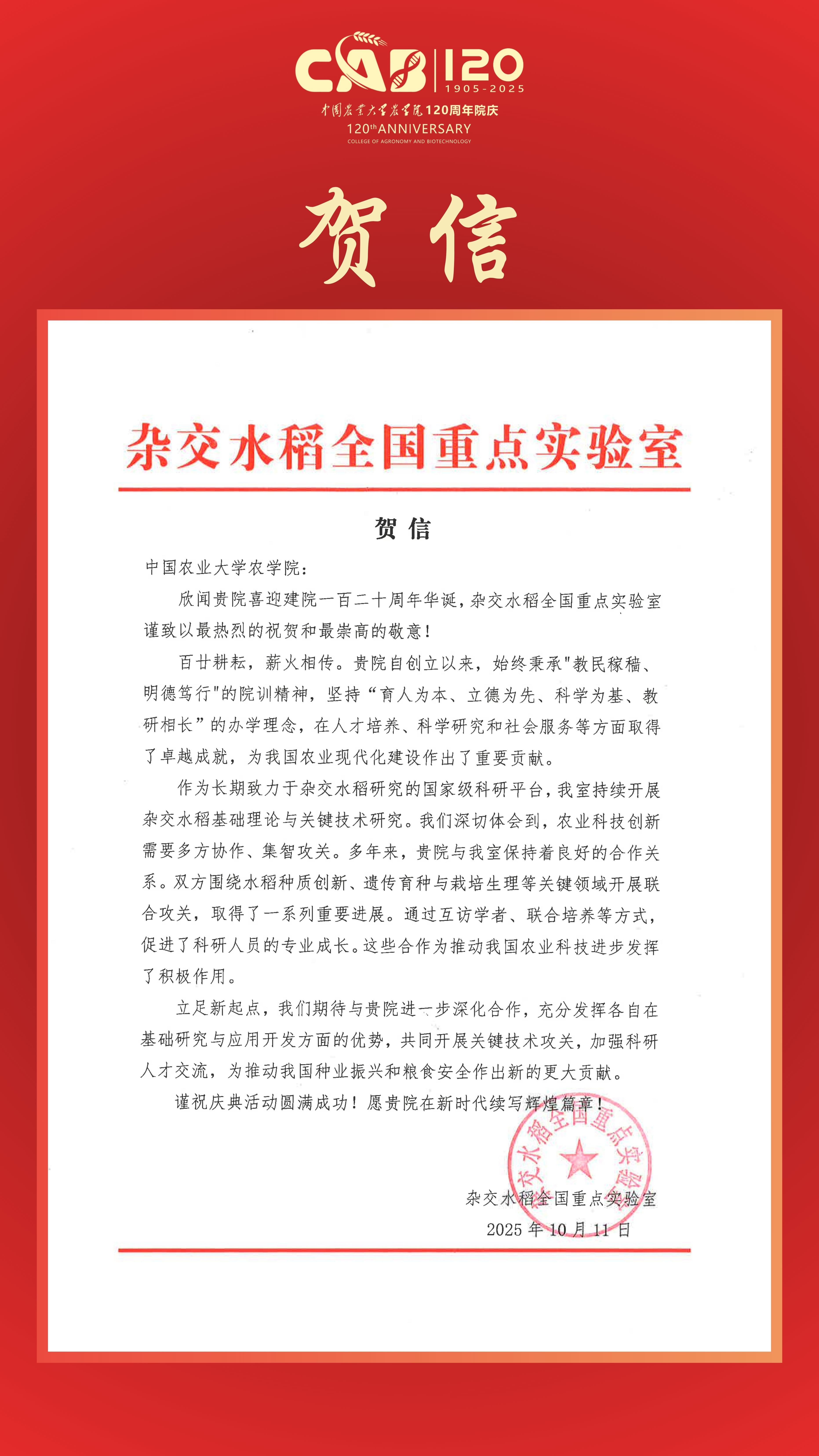 贺信|杂交水稻全国重点实验室致信祝贺太阳集团城娱8722建院120周年
