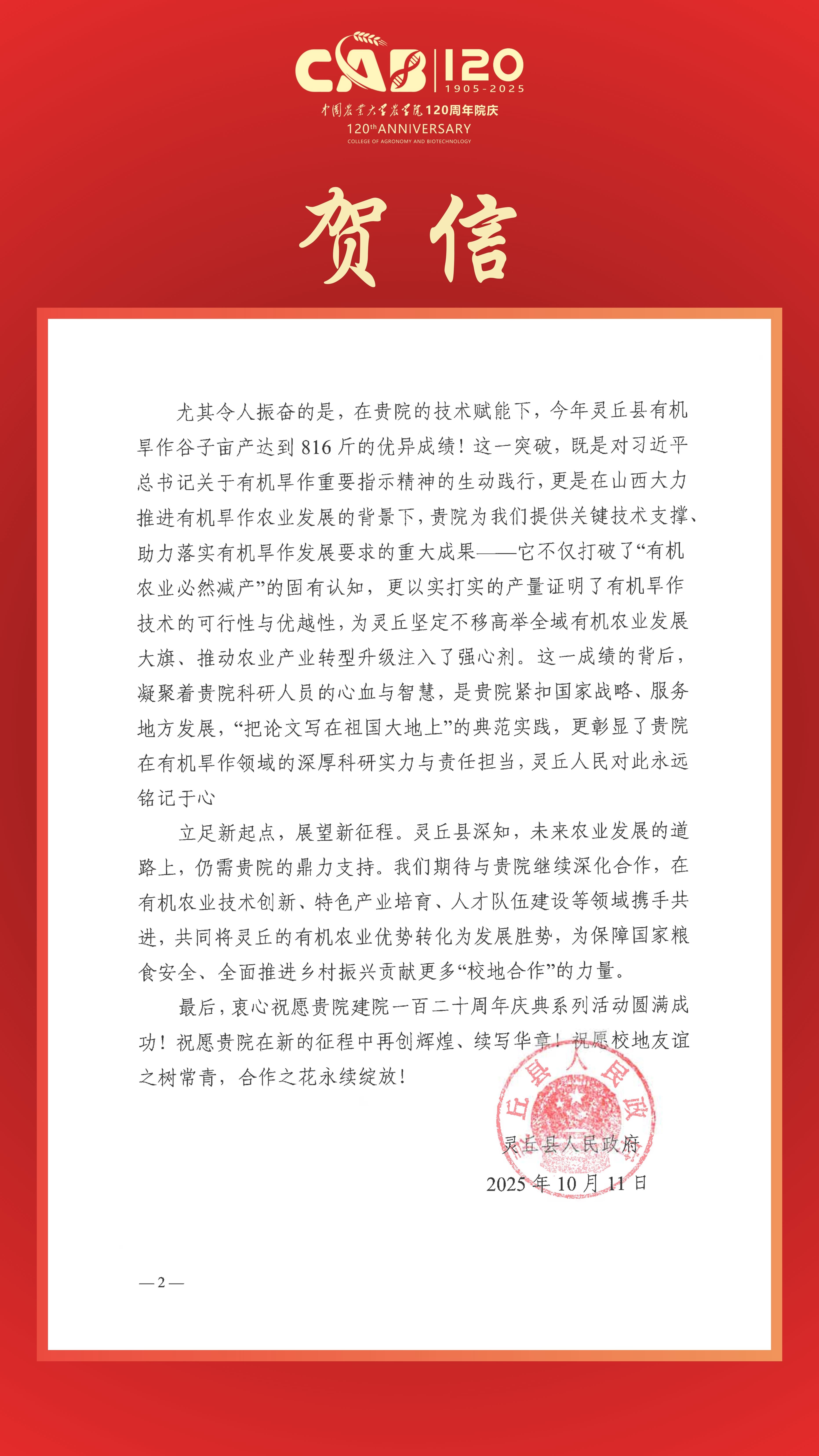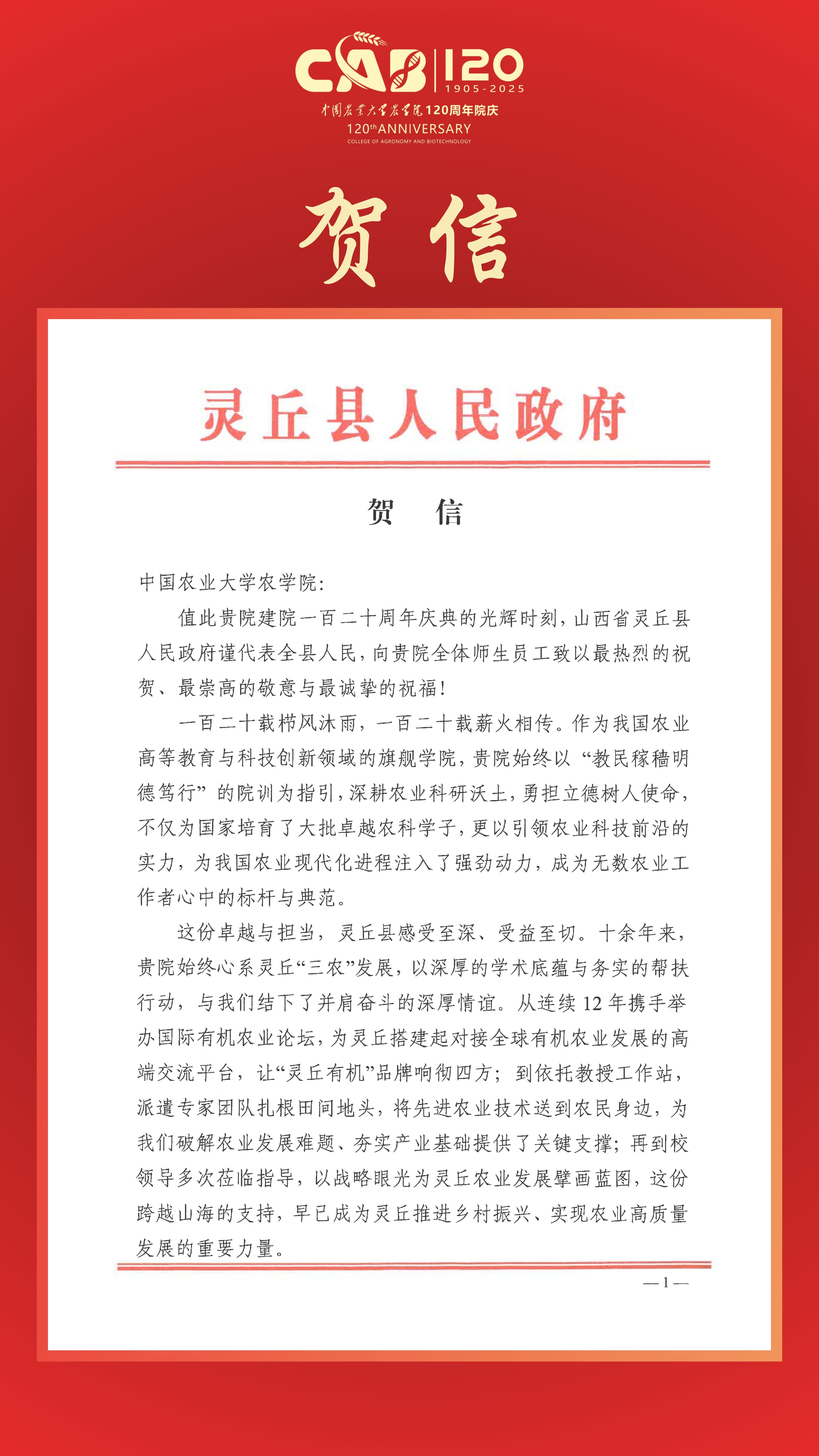 贺信|灵丘县人民政府致信祝贺太阳集团城娱8722建院120周年