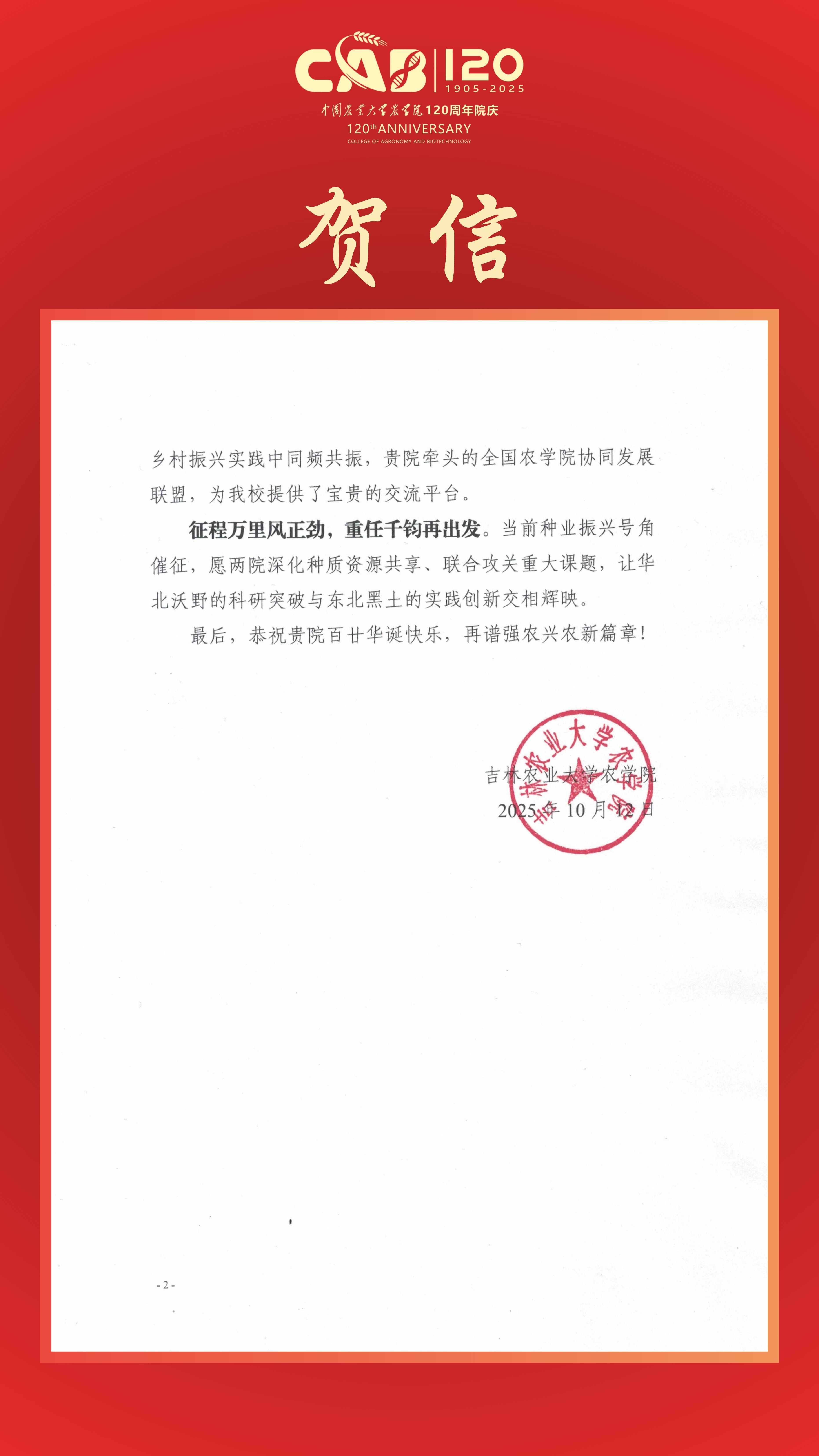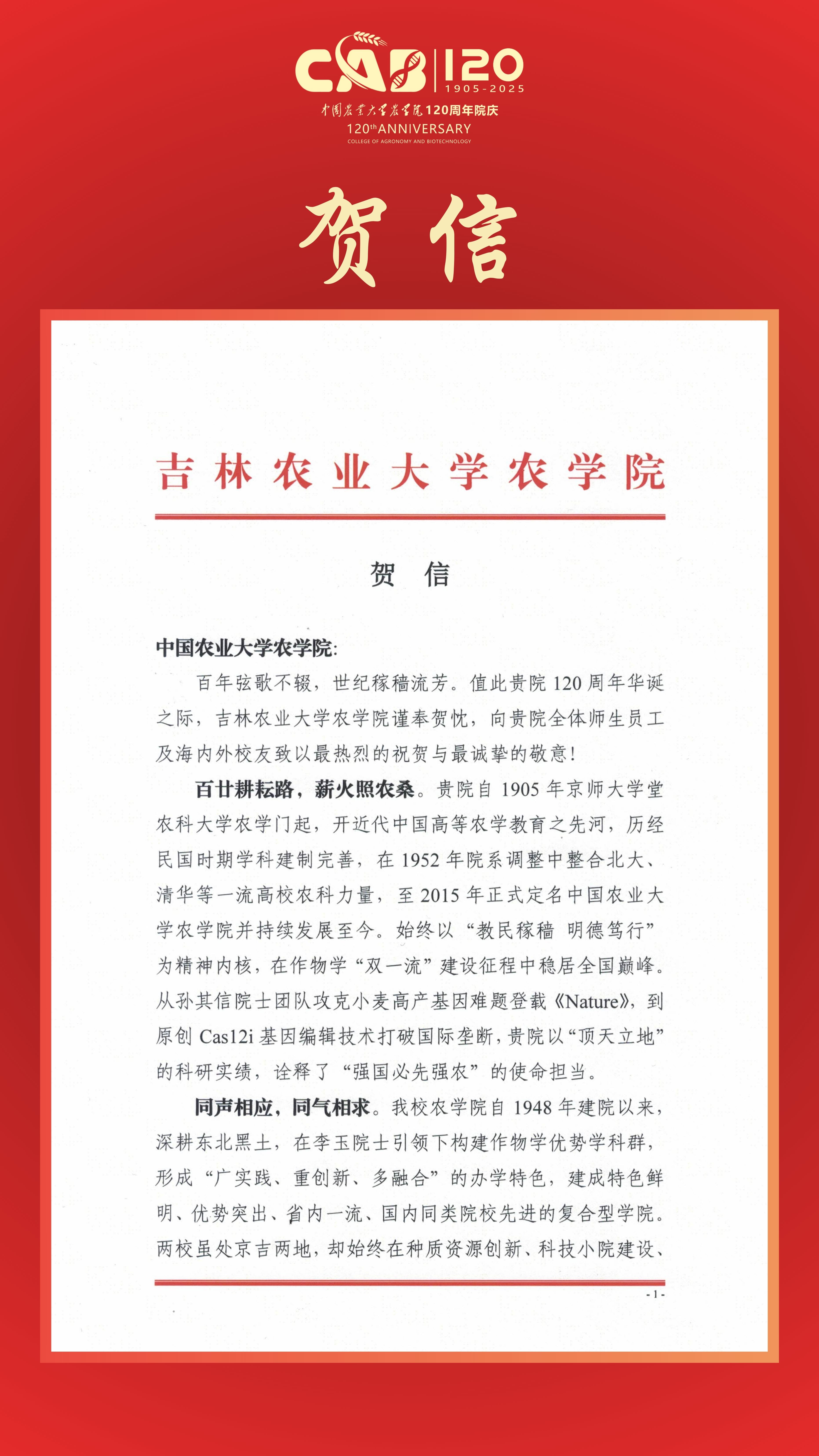 贺信|吉林农业大学太阳集团城娱8722致信祝贺太阳集团城娱8722建院120周年