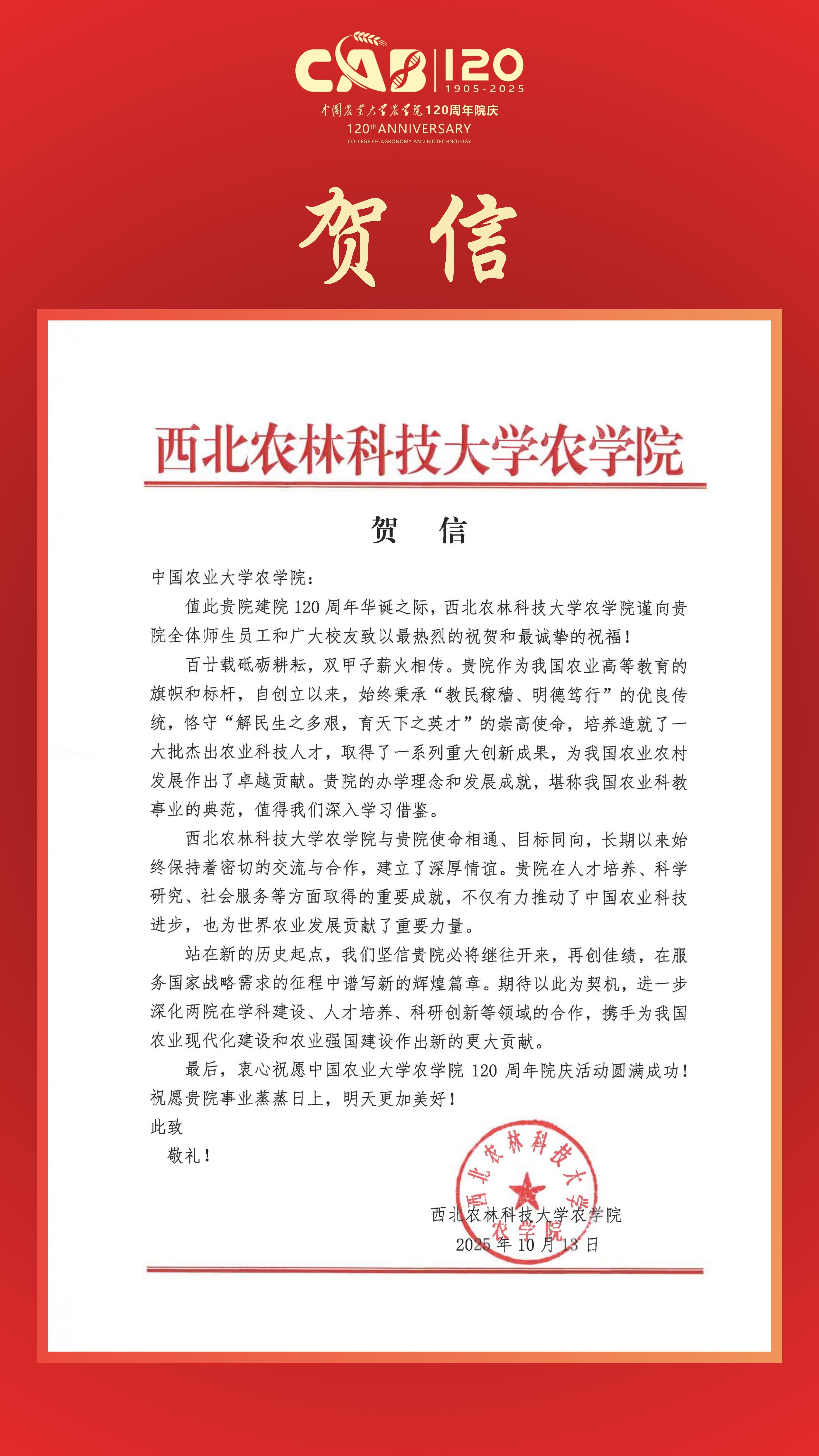 贺信|西北农林科技大学太阳集团城娱8722致信祝贺太阳集团城娱8722建院120周年