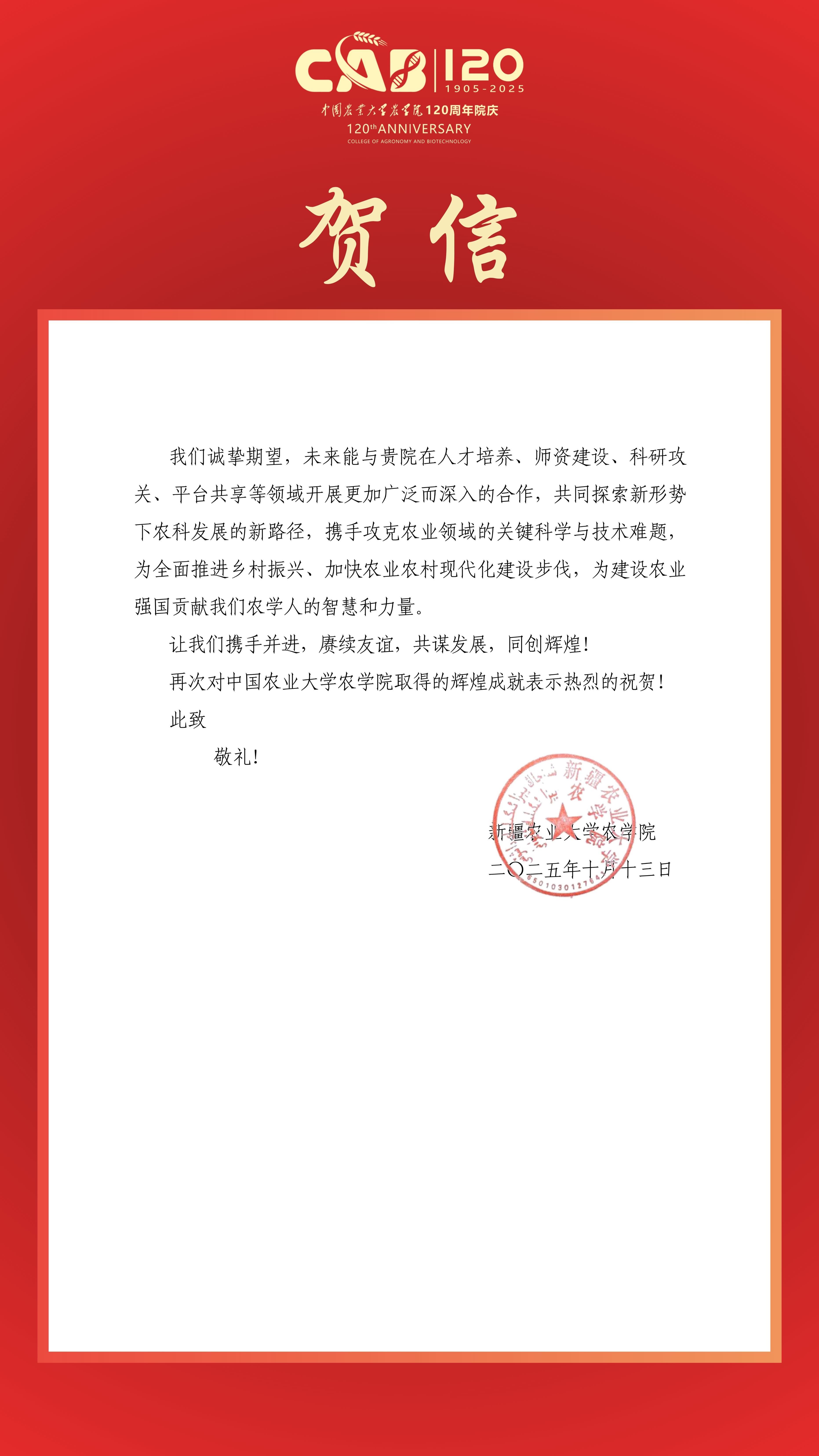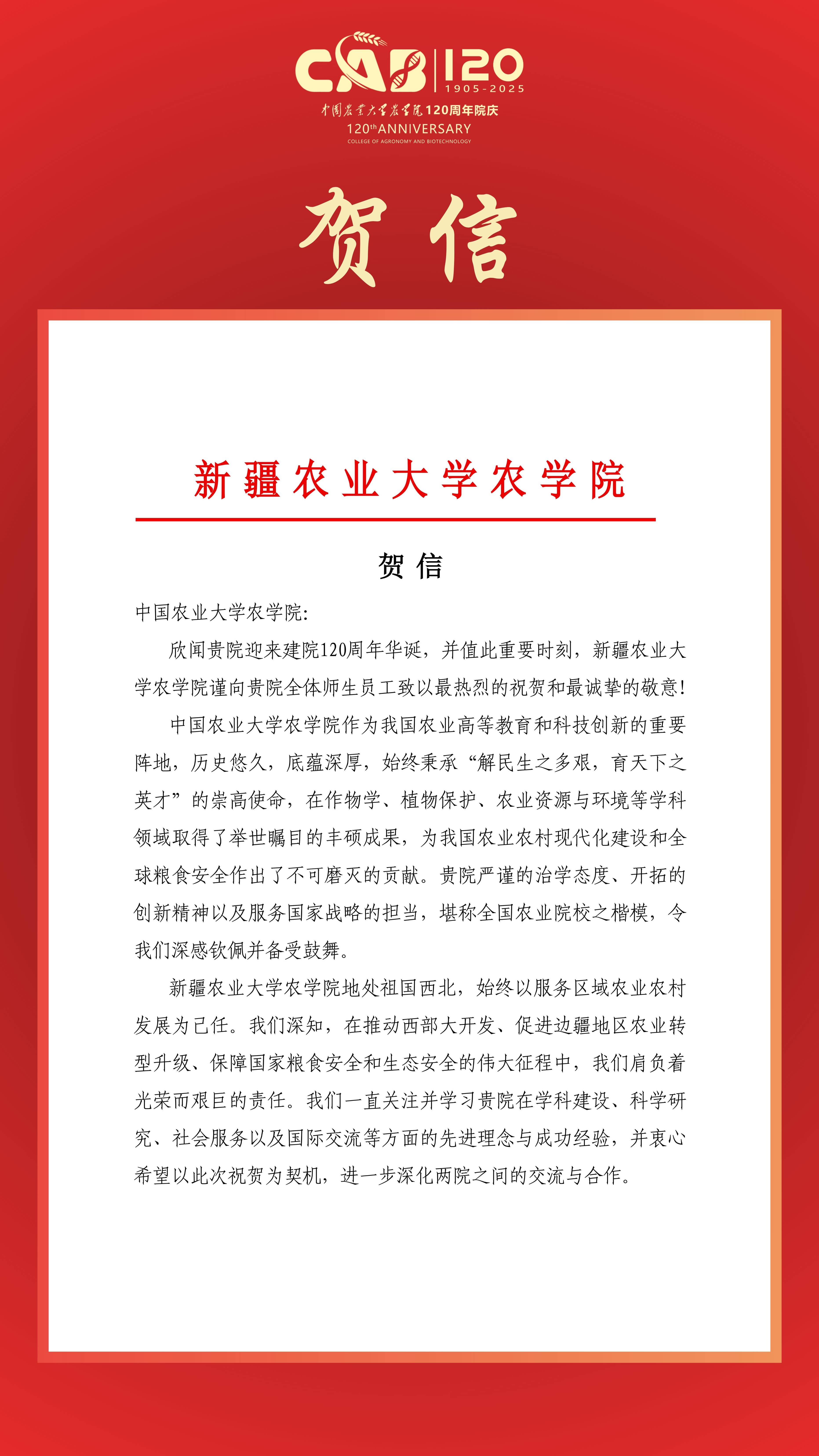 贺信|新疆农业大学太阳集团城娱8722致信祝贺太阳集团城娱8722建院120周年