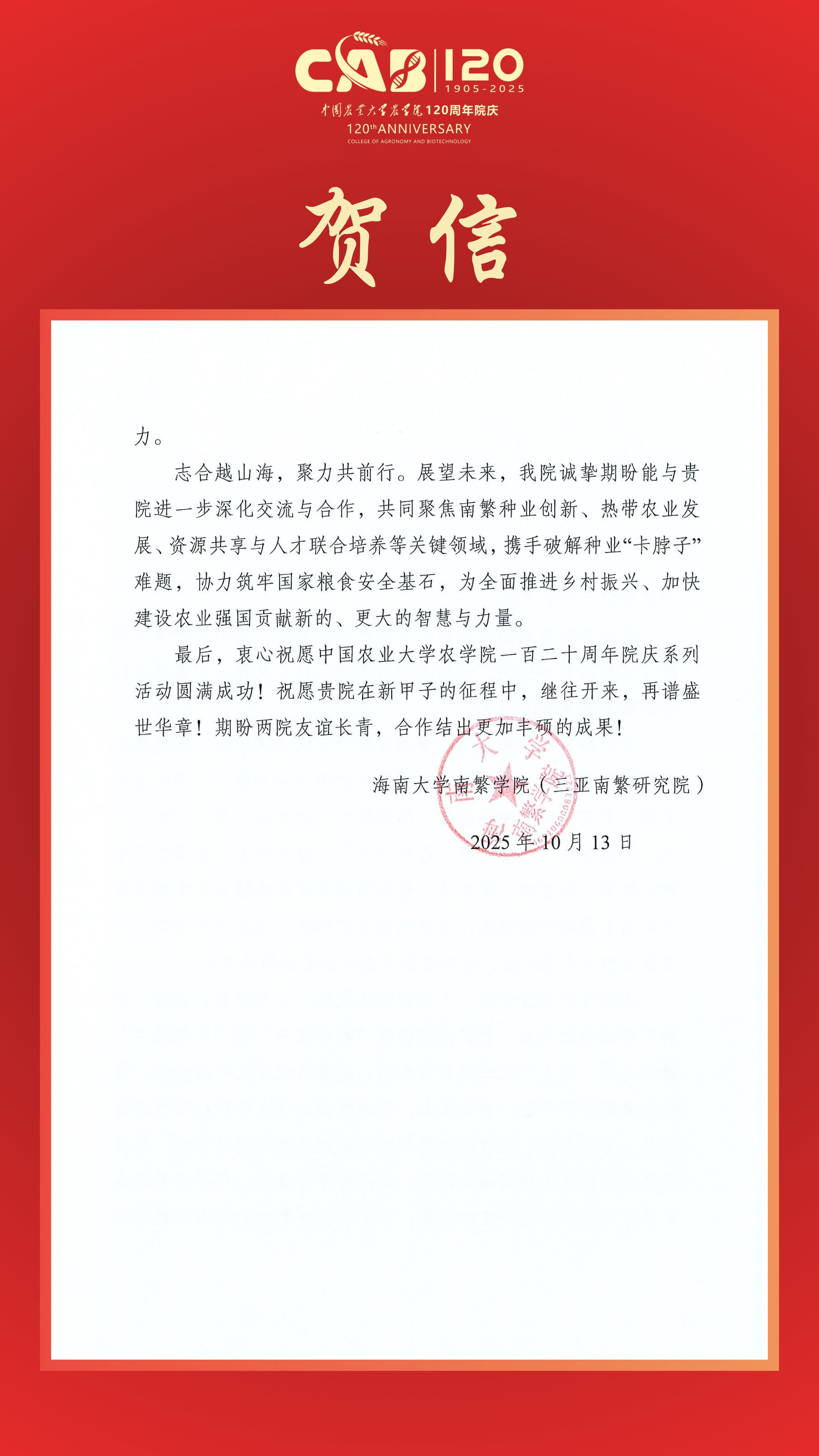 贺信|海南大学南繁学院(三亚南繁研究院)致信祝贺太阳集团城娱8722建院120周年