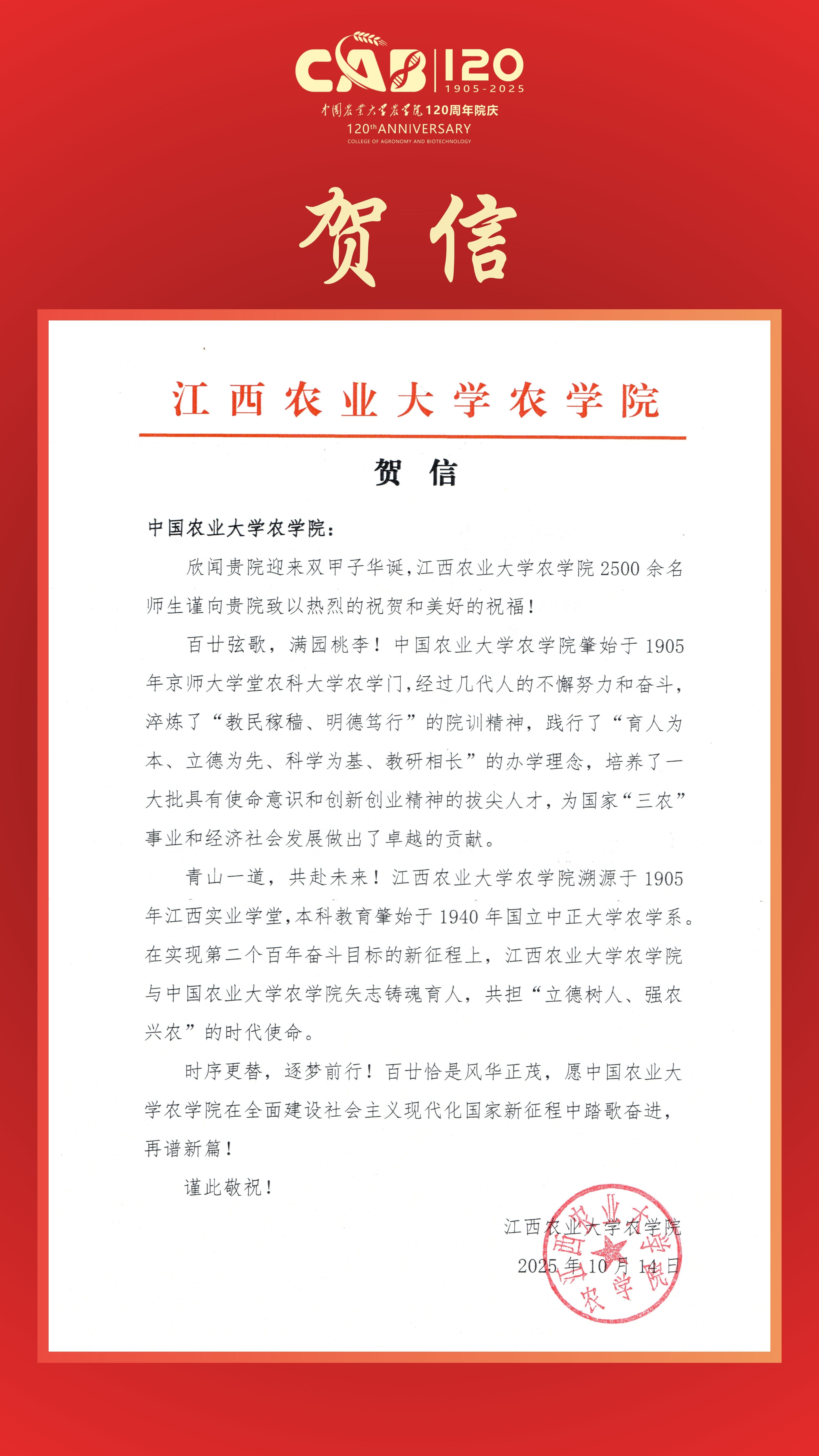 贺信|江西农业大学太阳集团城娱8722致信祝贺太阳集团城娱8722建院120周年