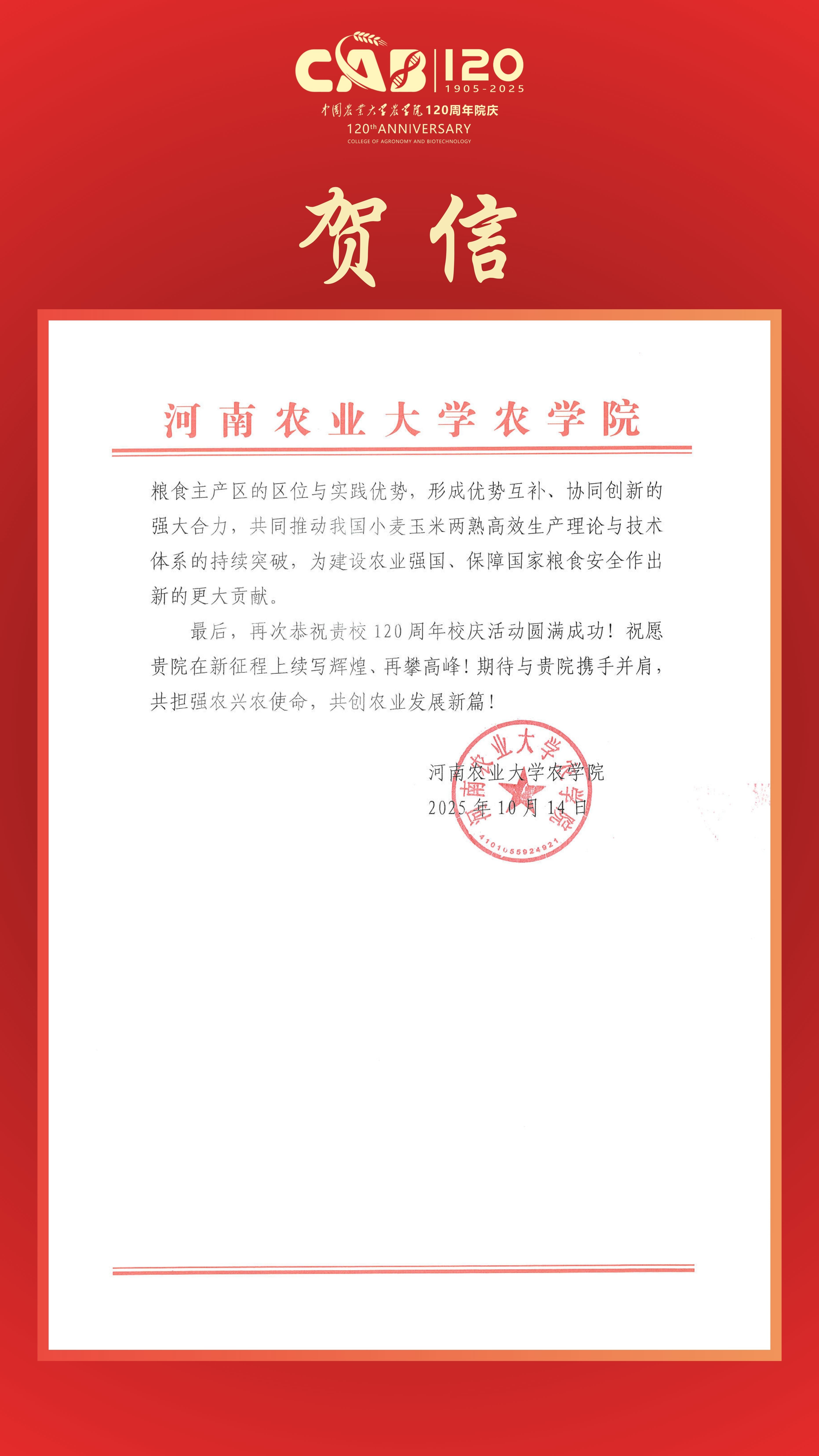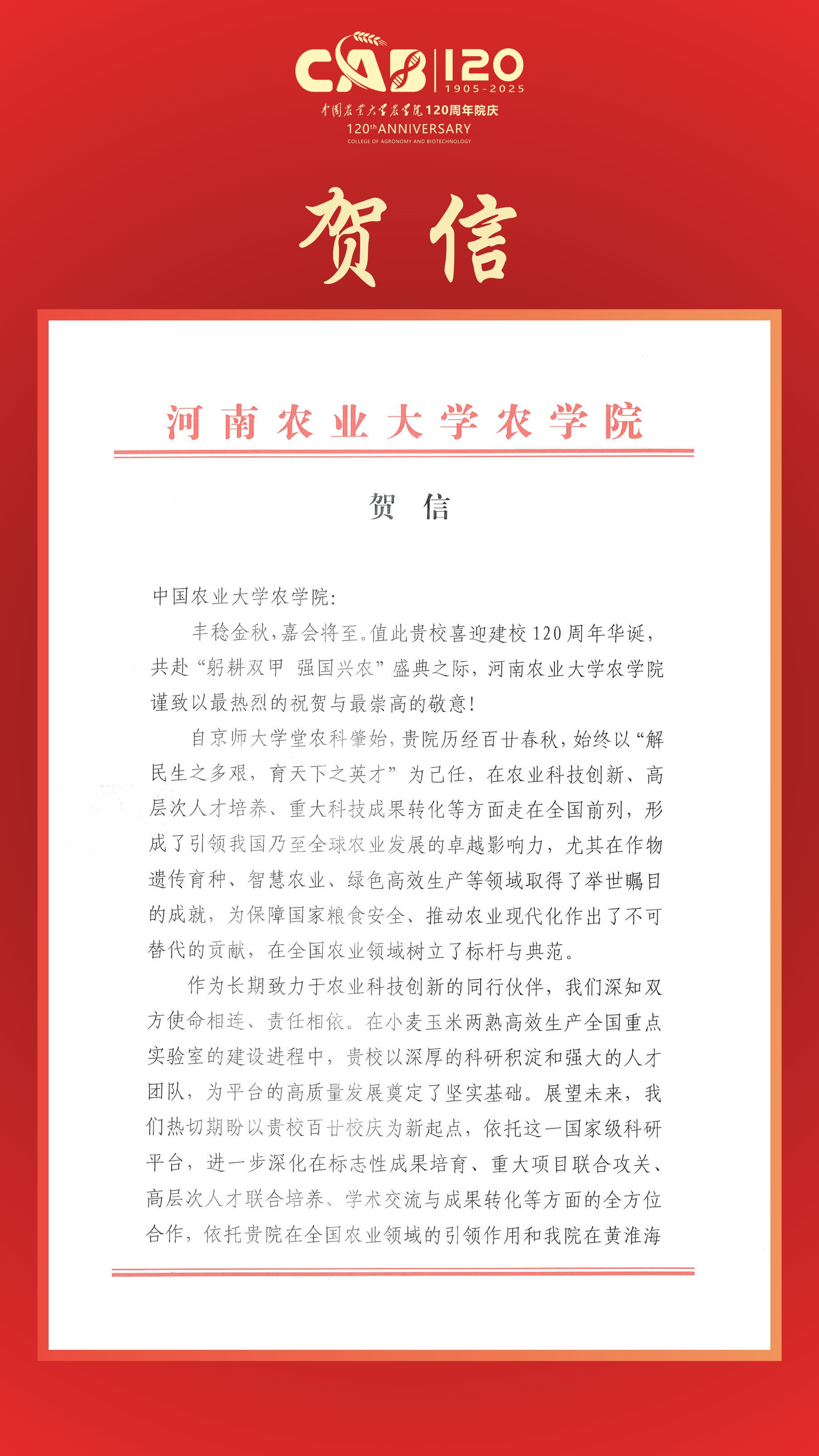 贺信|河南农业大学太阳集团城娱8722致信祝贺太阳集团城娱8722建院120周年
