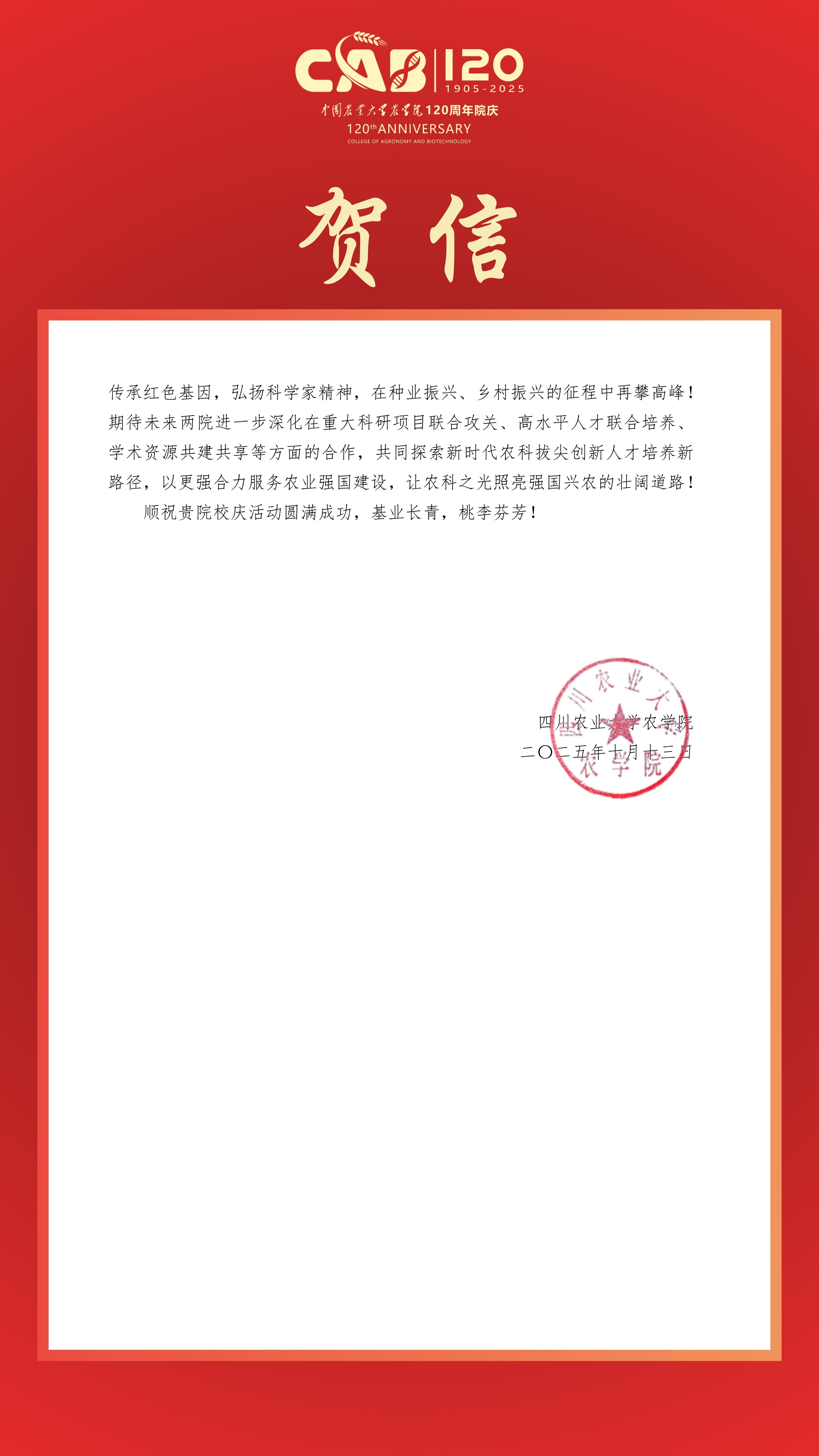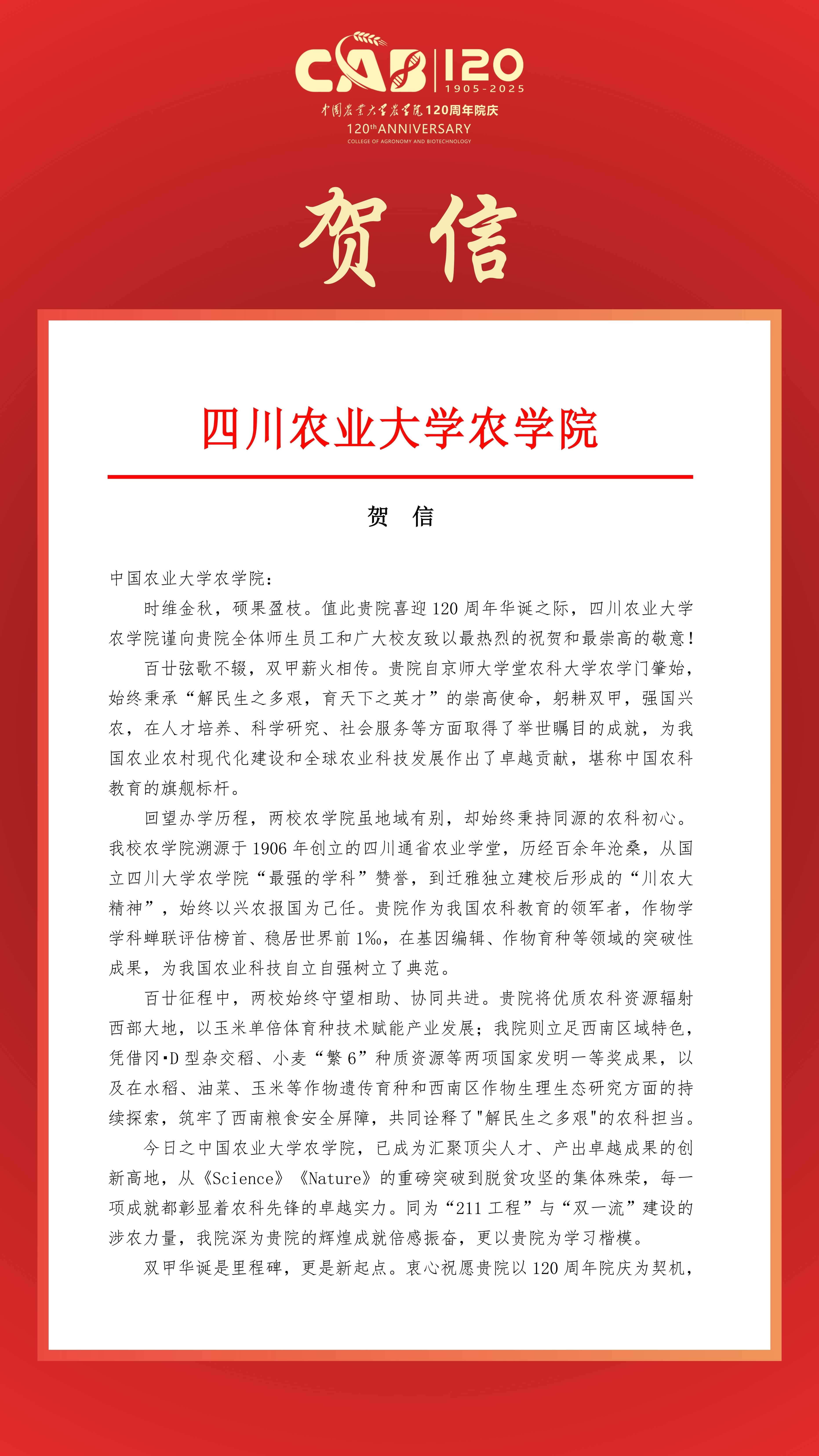 贺信|四川农业大学太阳集团城娱8722致信祝贺太阳集团城娱8722建院120周年