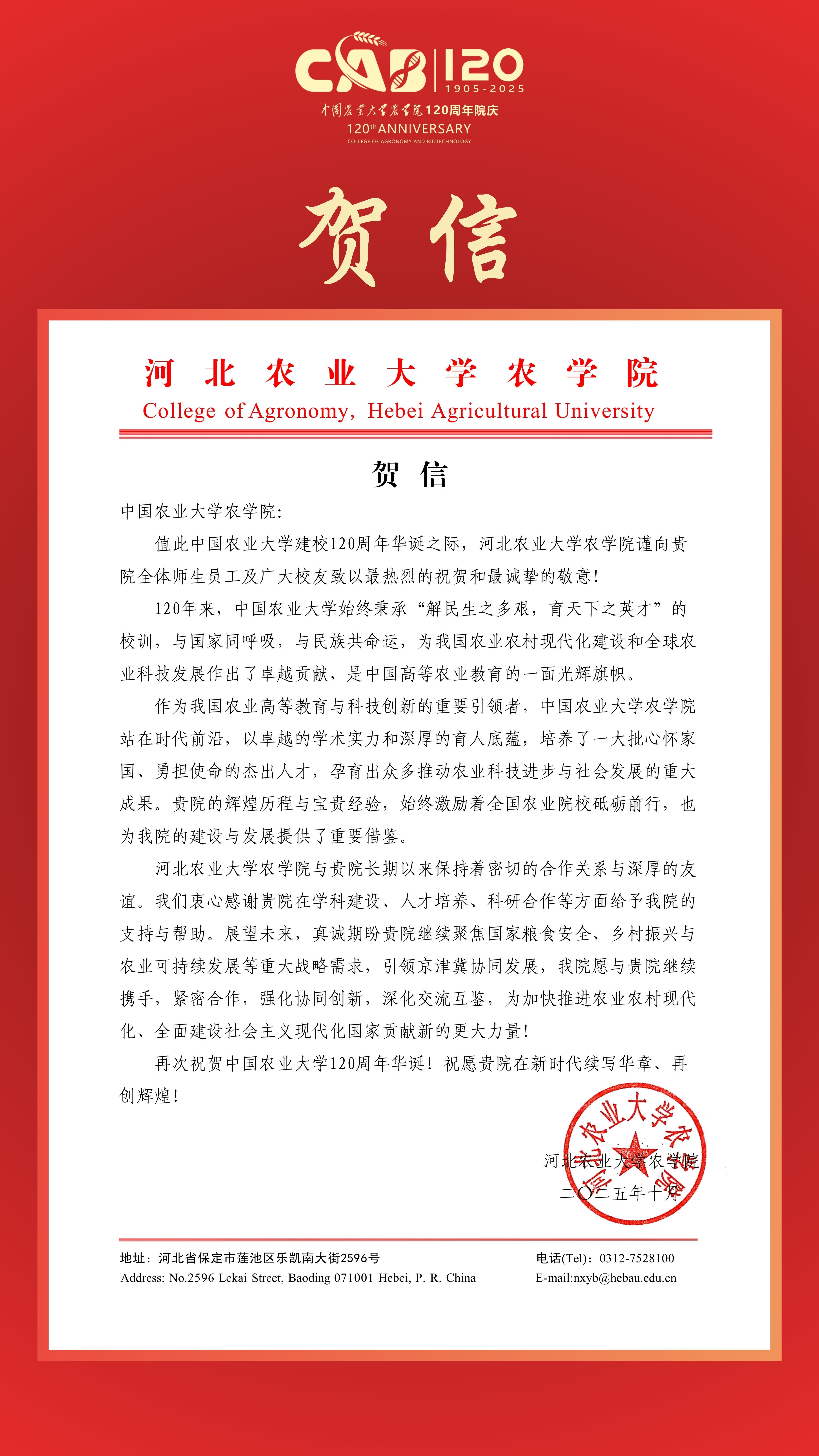 贺信|河北农业大学太阳集团城娱8722致信祝贺太阳集团城娱8722建院120周年