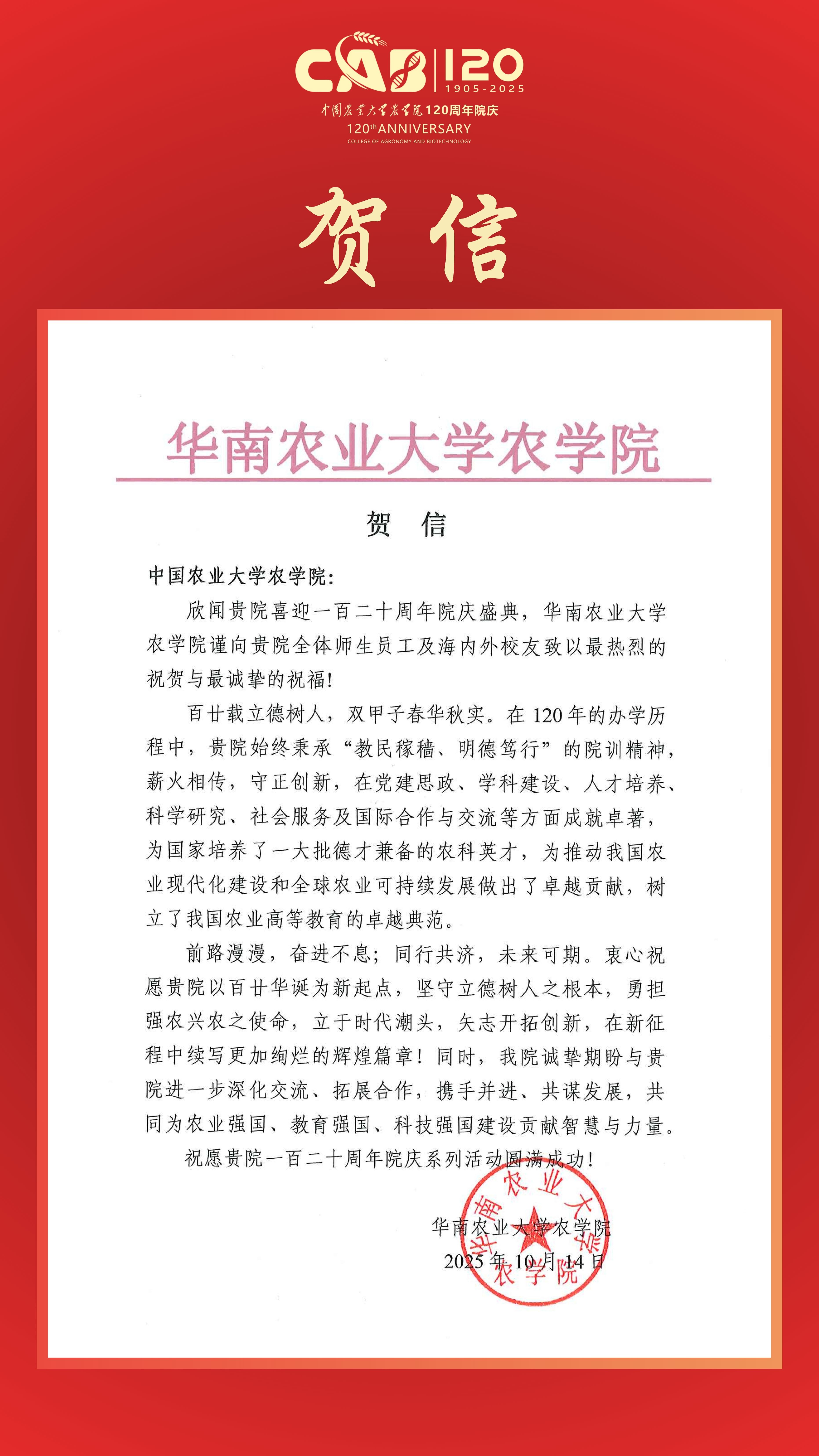 贺信|华南农业大学太阳集团城娱8722致信祝贺太阳集团城娱8722建院120周年