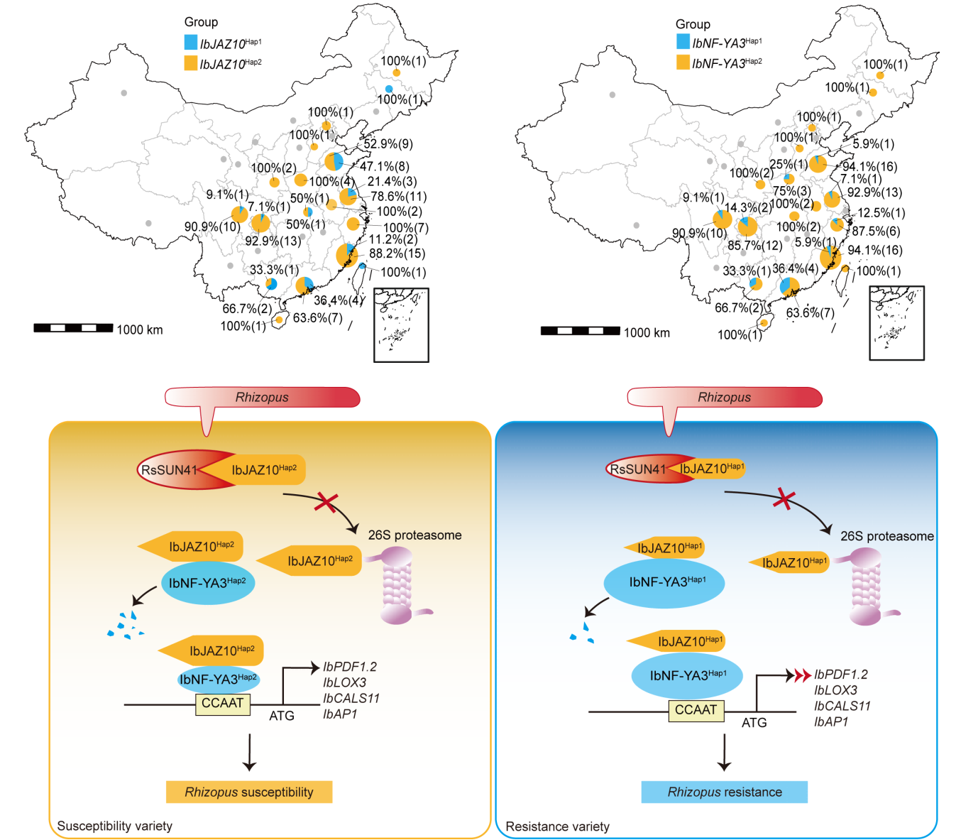 为深入解析软腐病对甘薯的致病机理,研究团队鉴定到MY03中的关键致病效应子RsSUN41,其可以抑制IbJAZ10被26S蛋白酶体的降解,从而稳定其蛋白。进一步研究表明,IbJAZ10可以靶向IbNF-YA3促进其降解,抑制宿主的多种防御途径,促进病原菌侵染。最后,基于110份中国甘薯种质资源,分析了IbJAZ10和IbNF-YA3单倍型的地理分布。抗病性单倍型IbJAZ10Hap1和IbNF-YA3Hap1在全国范围内利用率较低,这凸显了它们在甘薯育种中提升采后贮藏稳定性和延长货架期的潜力。