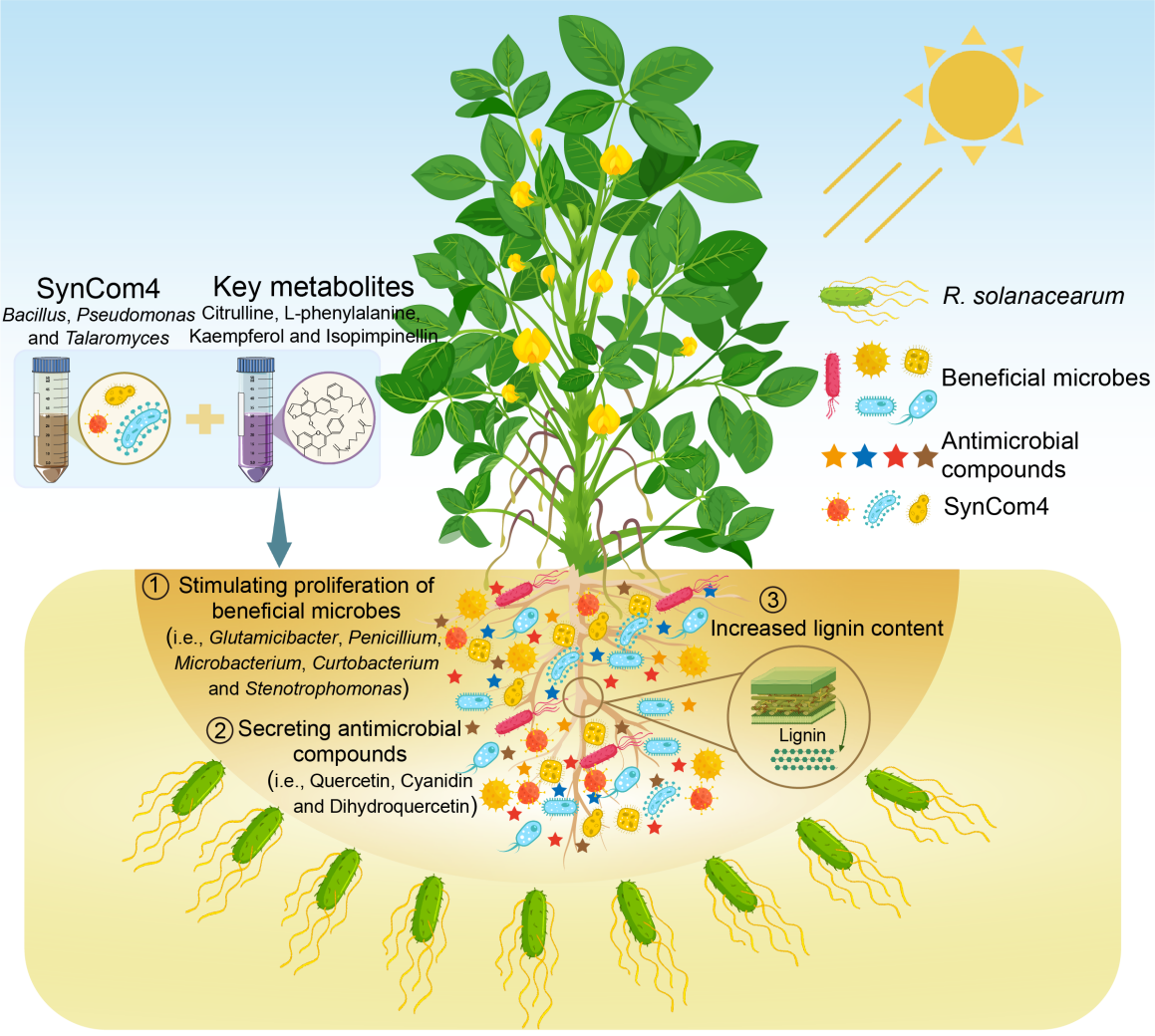 该研究利用扩增子测序和LC-MS技术,比较了抗病品种(日花3)与感病品种(日花99)在青枯病病原菌入侵下的根际微生物群落组成与代谢物差异及其相互关系。分离根际关键微生物并结合微生物-代谢物共培养,明确了特定代谢物对关键微生物生长的影响。最后,确定用于后续研究的关键微生物和代谢物,通过构建人工菌群(SynCom)及其与代谢物组合,解析根际关键微生物协助感病品种花生抵御青枯病入侵的潜在机制。研究发现,青枯病病原菌(R. solanacearum)接种显著降低感病品种微生物多样性和网络复杂性,增加抗病品种微生物网络复杂性。接种R. solanacearum的抗病品种显著富集多个与植物健康相关的代谢途径(如链霉素生物合成、苯丙烷生物合成和异黄酮生物合成),并特异性富集三种潜在关键微生物(Bacillus,Pseudomonas和Talaromyces)与四种关键代谢物(citrulline,L-phenylalanine,kaempferol和isopimpinellin)。体外微生物-代谢物共培养实验证实,这些代谢物能够促进三种潜在关键微生物的生长。体外细菌/真菌-细菌互作实验表明,由三个菌株组成的人工菌群(SynCom4)对R. solanacearum生长的抑制效果优于单一菌株或两个菌株组成的合成群落。盆栽验证实验表明,SynCom4与代谢物联合施用比SynCom4单独施用抑制病原菌入侵的效果更佳,并显著富集更多有益微生物(Bacillus,Pseudomonas,Talaromyces等)。富集的这些有益微生物通过激活宿主免疫系统、诱导木质素合成及槲皮素、二氢槲皮素和矢车菊素等抗菌化合物的产生,进一步增强花生对病原菌的抗性。